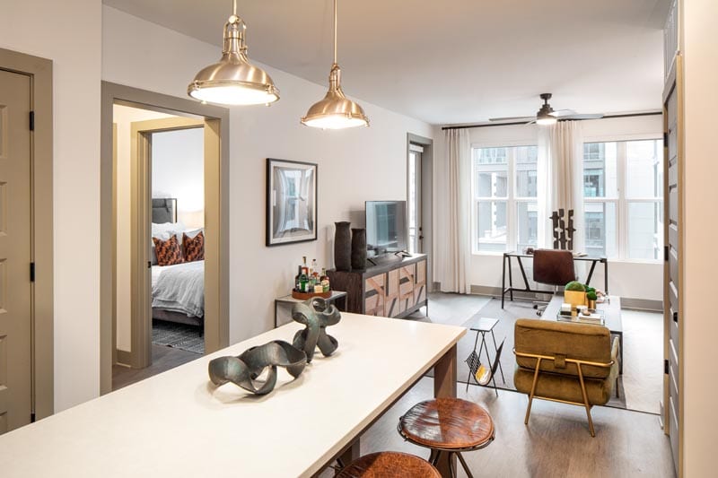 The model apartment units continue to tie industrial aesthetic in contemporary urban apartment design, specifically with elements such as the floor material and kitchen light fixtures.