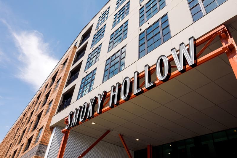 Prominent signage between support columns and trusses form entry of Smoky Hollow as the Line continues to bridge above the entry.