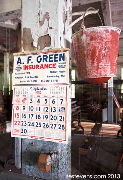 If you have not visited the Lonaconing Silk Mill (also known as the Klotz Throwing Company), I’d strongly encourage you to do so while we all have the opportunity. Long story short, this century-old building is the largest, most intact, silk mill of its type remaining in the entire United States. You can Google other blogs about the building’s history, I won’t rehash that. The mill shut down in 1957 leaving everything inside – equipment, personal items, office supplies – as is, to this very day.