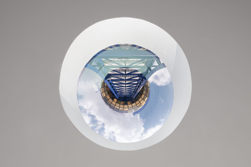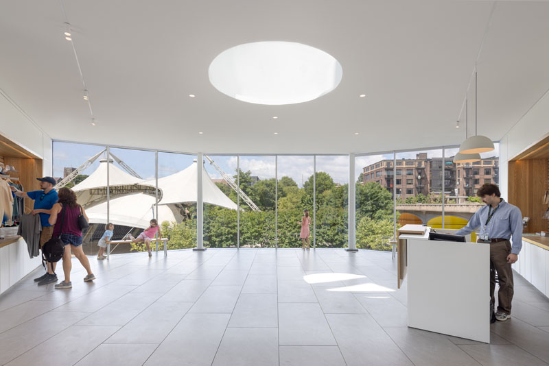 The welcome center overlooks the World’s Fair Park beyond and offers direct view up to the sphere through an oculus.